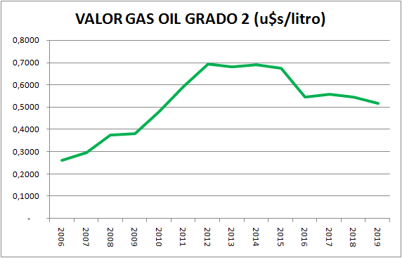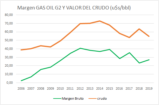 Actualizando los valores de márgenes brutos de refinación a noviembre de 2019 (último dato disponible), caemos en la cuenta que tanto los valores de crudo como combustibles en planta de despacho sin impuestos, prácticamente, no sufrieron nidificaciones respecto al mes anterior.