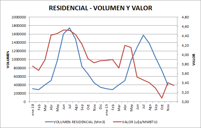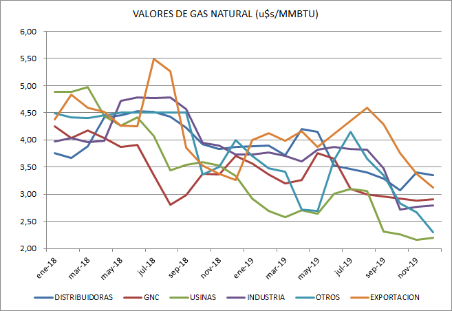 Más allá de la clasica forma de campana del consumo residencial en los meses invernales, se verifica también una tendencia declinante de los precios promedio, que llegan a un máximo de 4,60 dólares por millón de BTU y caen hasta un valor cercano a 3,0 u$s/MMBTU hacia fiens de 2019.