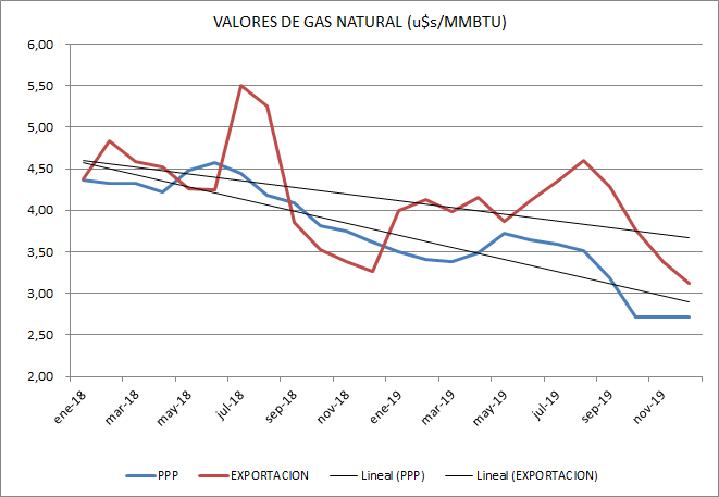 Y la comparación del precio promedio ponderado (PPP) del mercado interno con los valores del gas exportado: