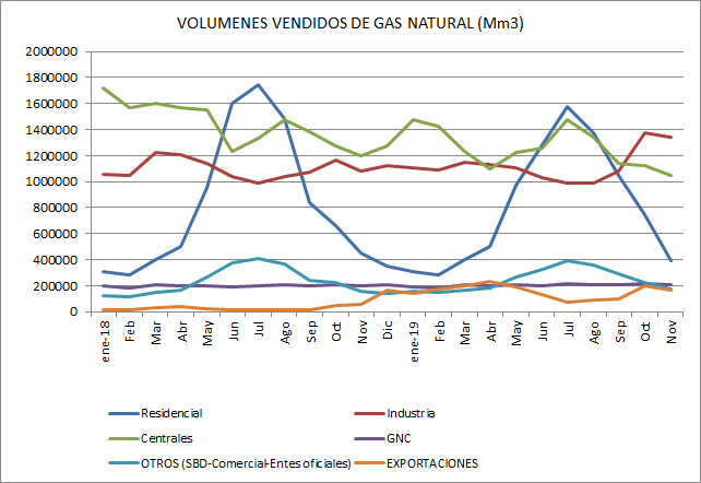Exceptuando la subida de la curva de gas entregado a Industria en los últimos meses de 2019, a contramano de la situación del país (igual que el crecimiento de ventas de naftas y gasoil), el resto a descendido (Residencial, Centrales) o se ha mantenido (GNC).
