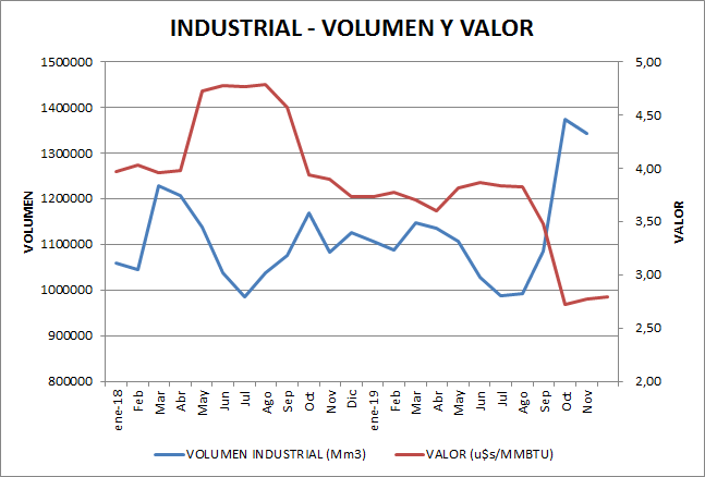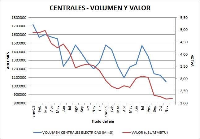 En el caso del GNC se nota un leve crecimiento del volumen vendido y una persistente caída del valor económico del gas que pasa de unos 4,25 u$s/MMBTU a principios de 2018 a 3 u$s/MMBTU a finales de 2019.