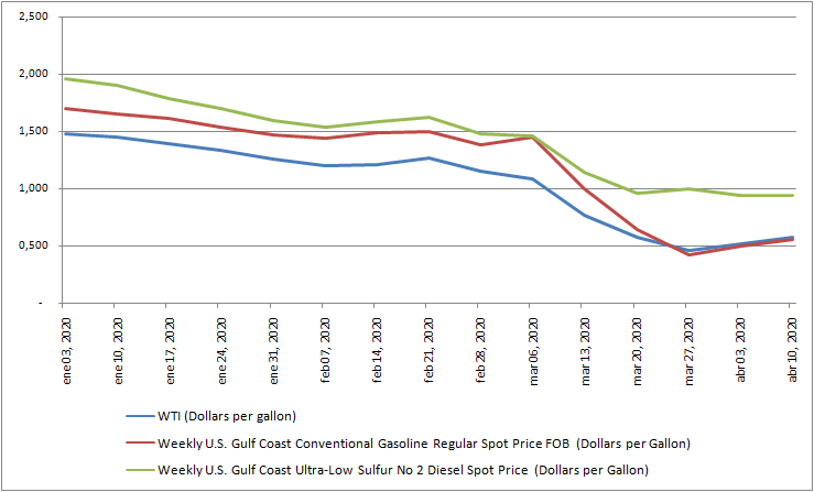 Tomando en consideración la variación de los productos clásicos y del WTI se verifica que, hasta esta semana donde se produce el derrumbe del precio del crudo por ausencia absoluta de demanda, los productos caían más que el crudo en su valor.