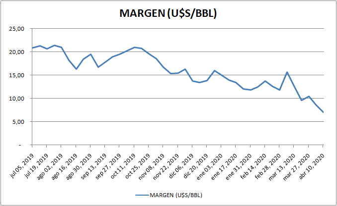 Aquí puede verse claramente que el margen cayó desde 20 dólares por barril en enero a 7 dólares en la segunda semana de abril.