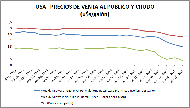 En primer lugar mostramos un gráfico con valores de precios en surtidor de naftas y gasoil en USA y el de WTI, Los productos son seleccionados para poder compararlos con los del mercado local.
