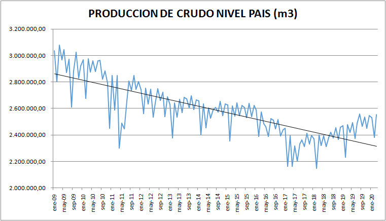 La tendencia general del período analizado es decreciente, aunque se verifica una ruptura a partir de 2017 producto de la aparición de la producción proveniente de operaciones no convencionales en la formación Vaca Muerta.