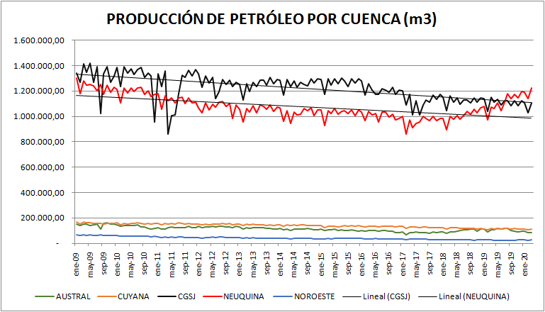 En el gráfico puede observarse que hay dos cuencas que son preponderantes en nuestro país, a saber: Cuenca del Golfo San Jorge y Cuenca Neuquina. Las otras, con preeminencia de Cuyana y Austral, tienen producciones menores a 200.000 m3 mensuales.