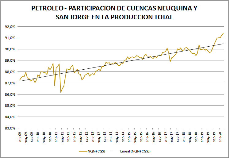 La participación de estas dos cuencas principales no sólo ha sido, y es, muy importante, sino que ha ido creciendo en el tiempo, fundamentalmente por el aumento de producción en cuenca neuquina por la explotación no convencional.
