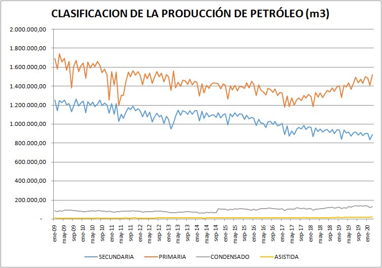 La clasificación que hace la Secretaría de Energía de la producción de petróleo es: producción primaria, producción secundaria, producción asistida y producción de condensado.