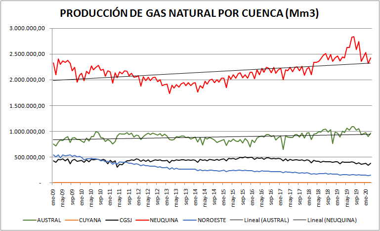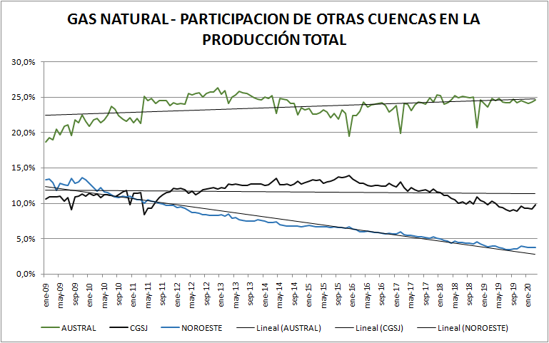 Aquí vemos que la Cuenca subió su participación en el total de la producción de gas natural del 56% en 2009 a casi el 62% en marzo de 2020.