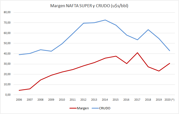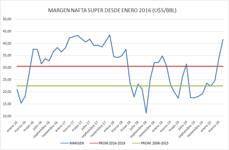 Para la nafta grado 2, en diciembre de 2017 el margen fue de 43,5927 u$s/bbl mientras que en abril de 2020 fue de 41,6653 u$s/bbl. Sólo un 4,49% por debajo del mayor valor.