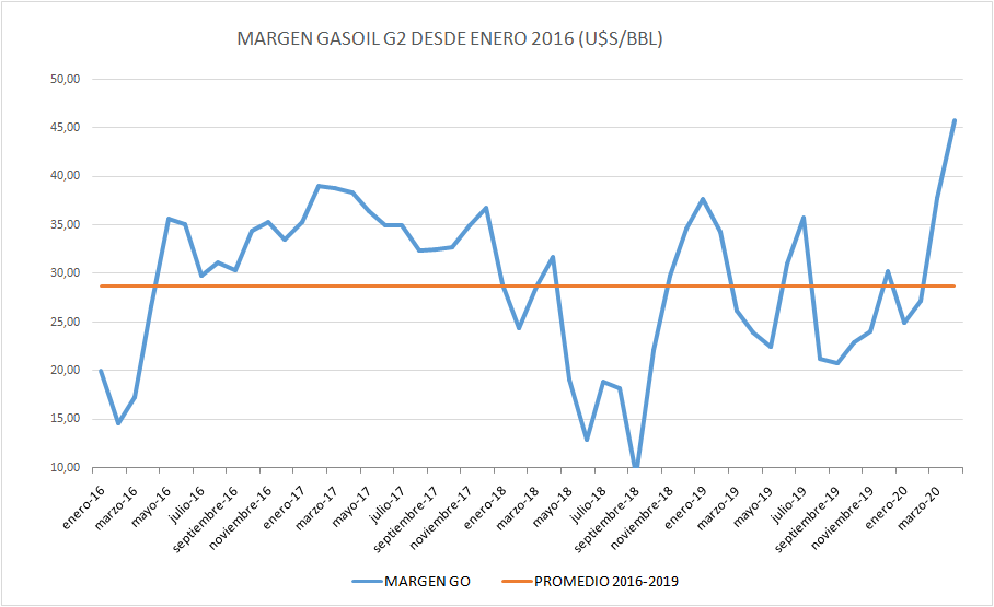 Hay que remontarse a septiembre de 2011, donde el margen bruto de refinación del gasoil fue de 45,0435 dólares por barril, para encontrar un valor similar al 44,9354 alcanzado en abril de 2020.