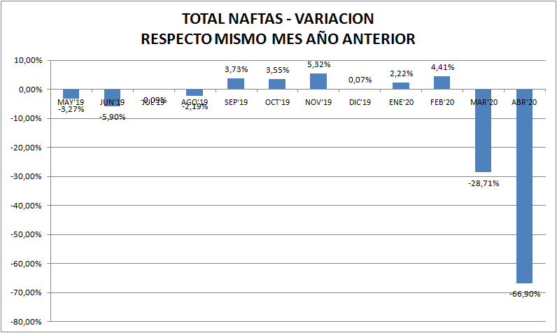Las ventas de naftas y gasoil (total país y todos los tipos) disminuyeron fuertemente en abril de 2020 respecto al mismo mes del año 2019.