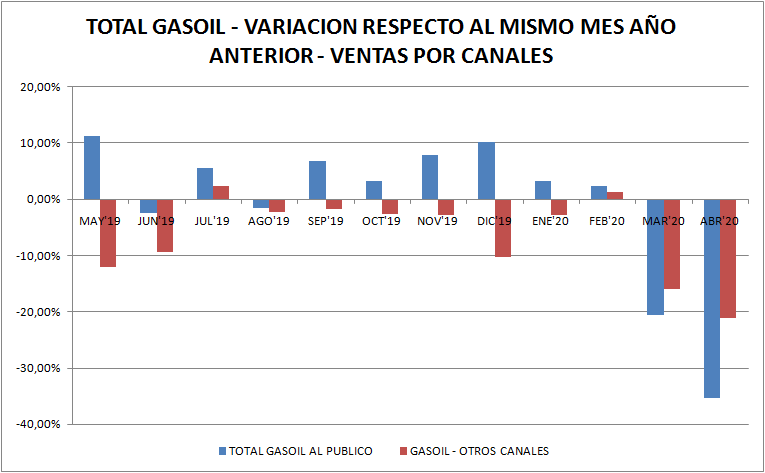 En el caso del gasoil total también se trataba del sexto mes consecutivo de subida en las ventas, truncada por la abrupta caída de marzo de 2020 y ahora una mucho más profunda de abril.