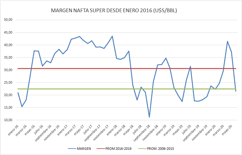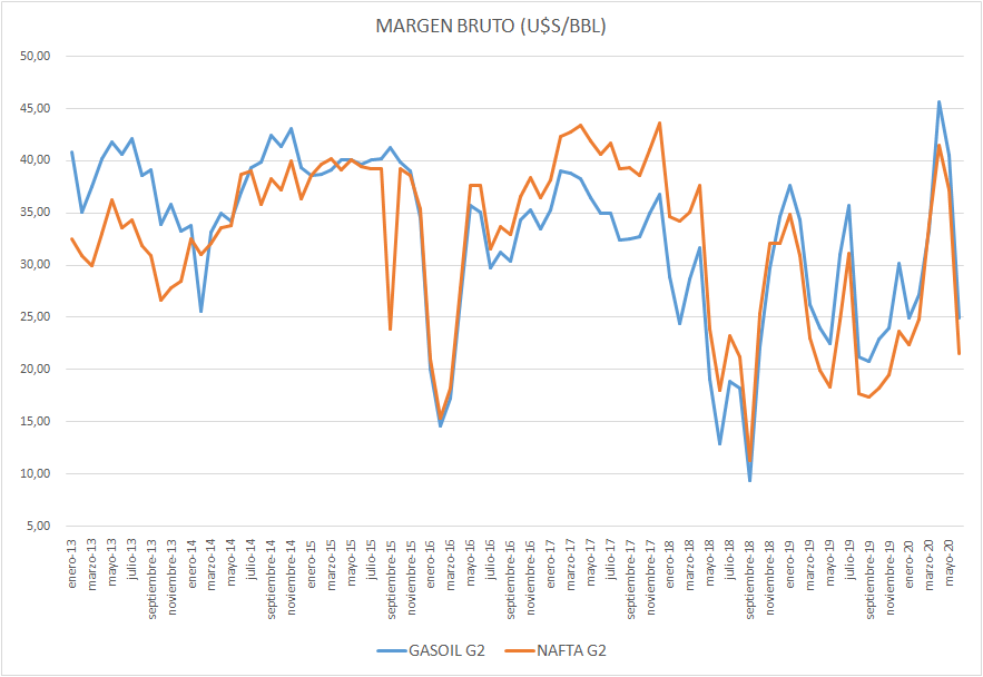 Al aumentar el petróleo crudo (sin llegar a 45 dólares por barril), aumentar el tipo de cambio y quedar prácticamente sin cambios el precio en planta de despacho sin impuestos, el margen bruto de refinación sufrió una importante caída en junio de 2020, referido al mes anterior.
