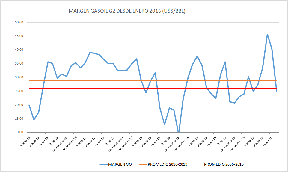 Con los valores que mostraremos, el margen bruto del gasoil cae por debajo del promedio histórico 2016-2019 y también un poco por debajo del promedio 2006-2015.