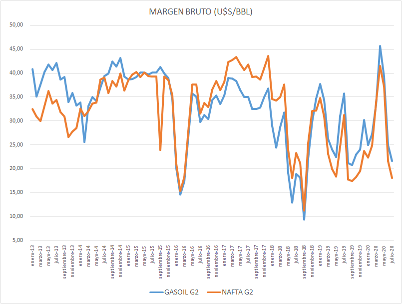 Al aumentar el petróleo crudo (sin llegar a 45 dólares por barril), aumentar el tipo de cambio y disminuir más de un 2% el precio en planta de despacho sin impuestos, el margen bruto de refinación sufrió una nueva caída en julio de 2020, referido al mes anterior.