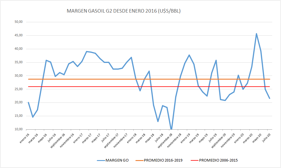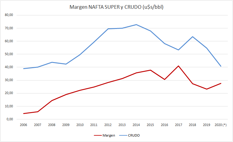 Con los valores que mostraremos, el margen bruto, tanto en la nafta súper como el gasoil grado 2, caen por debajo del promedio histórico 2016-2019 y también un poco por debajo del promedio 2006-2015.