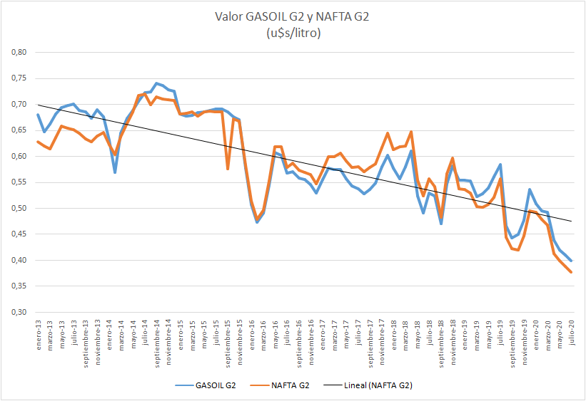 | En u$s/litro | NAFTA GRADO 2 | GASOIL GRADO 2 |