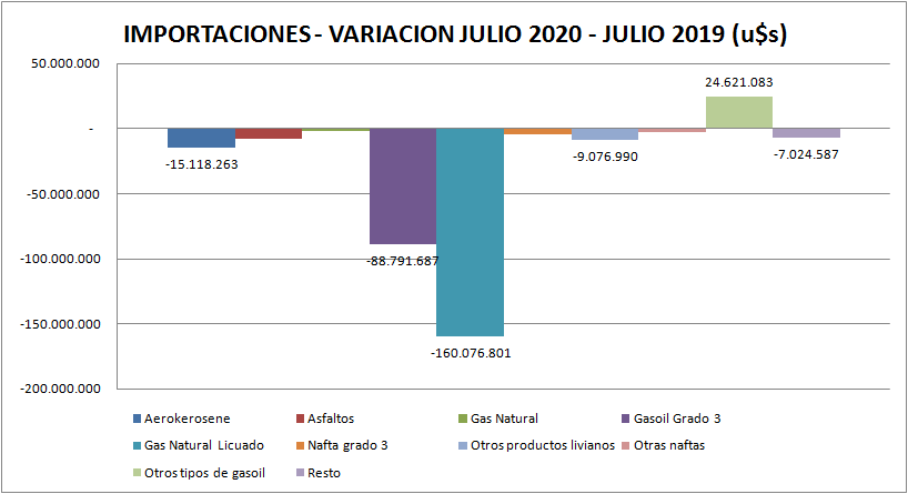 Gas natural licuado (GNL) producto del que no se produjeron importaciones en julio 2020 y gasoil grado 3, que tuvo un gran descenso, son los que lideran la bajante. Aerokerosene y asfaltos, representativos de actividad, también tuvieron bajas importantes.