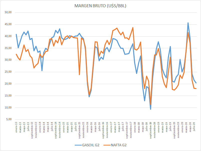 El margen bruto, tanto en la nafta súper como el gasoil grado 2, siguen por debajo del promedio histórico 2016-2019 y también un poco por debajo del promedio 2006-2015.