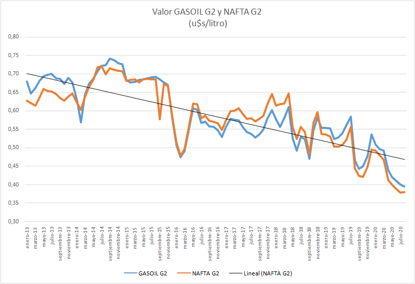 | En u$s/litro | NAFTA GRADO 2 | GASOIL GRADO 2 |