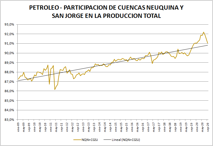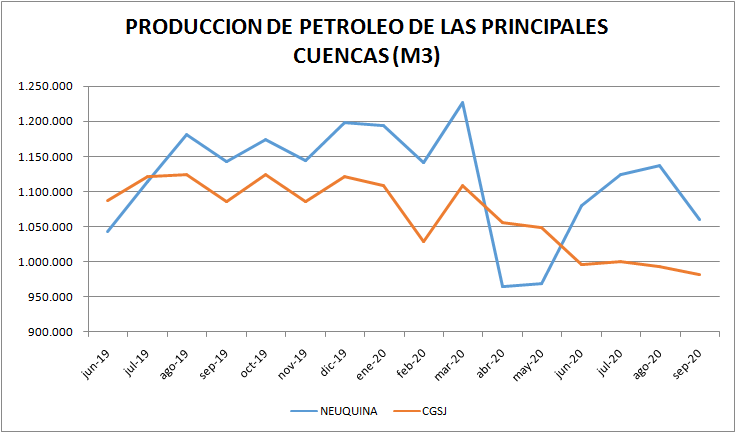 Con respecto a septiembre de 2019, solamente la Cuenca Noroeste subió un 8,60%, mientras todas las demás cuencas redujeron su producción, destacándose la Austral con una baja del 22,82%.