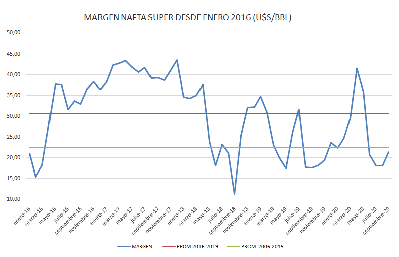 Sin embrago, el margen bruto, tanto en la nafta súper como el gasoil grado 2, siguen por debajo del promedio histórico 2016-2019 y también un poco por debajo del promedio 2006-2015.