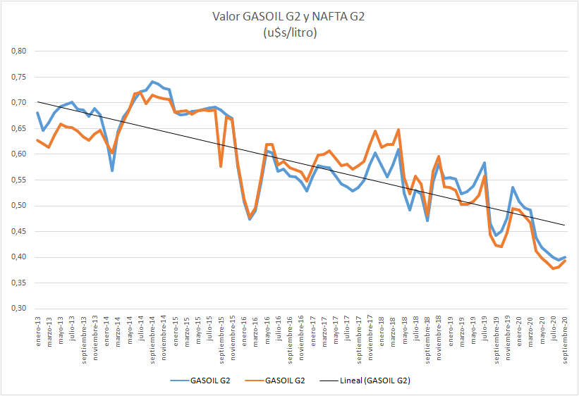 | En u$s/litro | NAFTA GRADO 2 | GASOIL GRADO 2 |