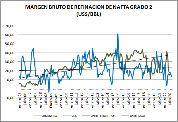 Hacemos la comparación con nuestra nafta grado 2 haciendo la salvedad de que los valores locales alcanza hasta septiembre de 2020.