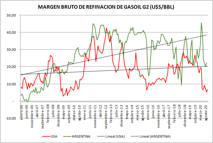 El último valor, en octubre, fue de 6,83 u$s/bbl, con un valor del producto de 1,099 u$s/galón.