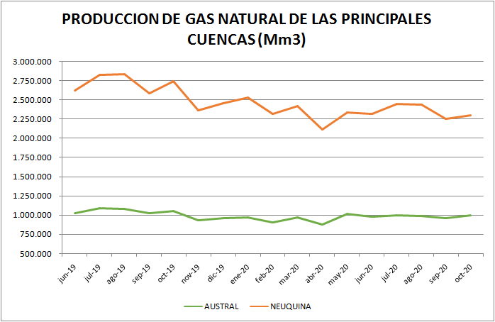 En lo que hace a la producción de gas natural, la misma aumentó 4,15% en octubre respecto a septiembre de 2020. El aumento se registró en todas las cuencas, aunque con un día operativo más.