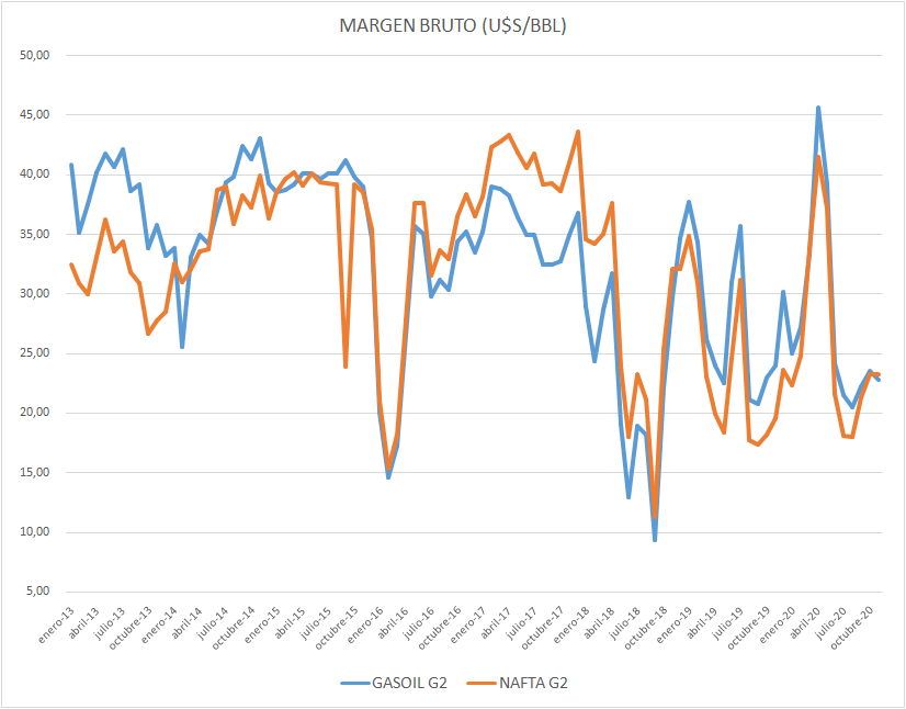 Como vamos a ver a lo largo del informe, las variables de cálculo del Margen Bruto de Refinación apenas se movieron, o lo hicieron de forma tal que el valor se mantuvo casi inalterable en el caso de la nafta grado 2 y disminuyó un 3,3% en el gasoil grado 2.