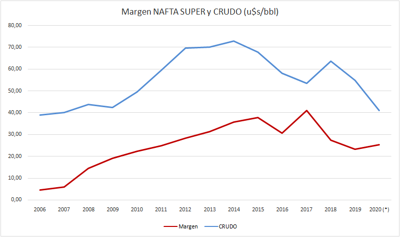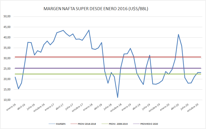 El margen de la nafta super sigue apenas por encima de promedio 2006-2015.