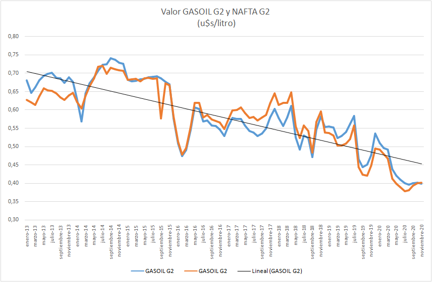 | En u$s/litro | NAFTA GRADO 2 | GASOIL GRADO 2 |