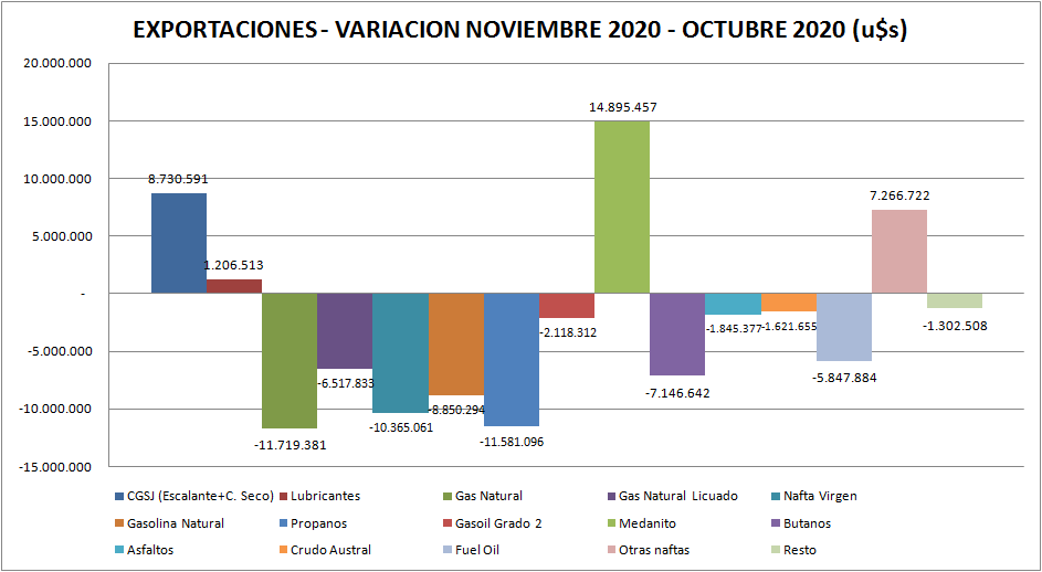 Las exportaciones de petróleo crudo de la Cuenca del Golfo San Jorge aumentan en 8,7 millones de dólares respecto a noviembre de 2019 y se incorpora una exportación de Medanito por casi 15 MMu$s que no estaba presente en el 2019.