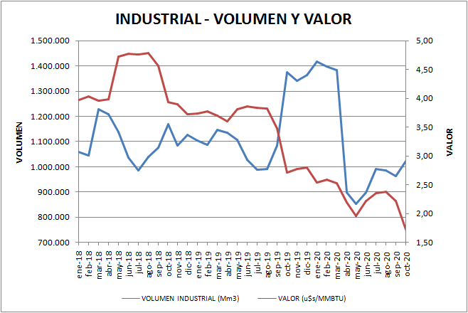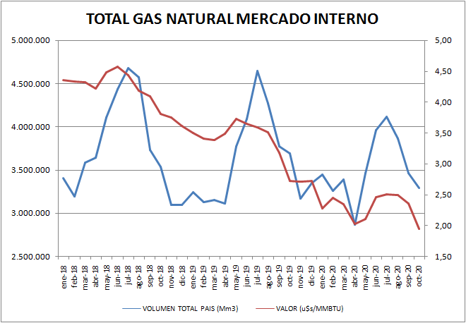 En el último mes informado, octubre de 2020, el consumo fue de 24,08 MMm3/día.