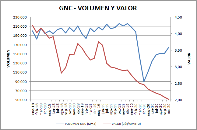 El GNC sigue a continuación y se puede apreciar el mantenimiento del volumen en el tiempo, salvo la interrupción de la curva provocada por la cuarentena.