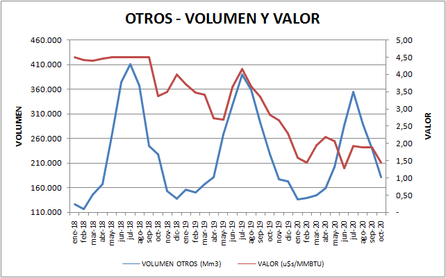 El volumen promedio del período (2018-2020) fue de 41,8 MMm3/día y el precio fue descendiendo en forma importante desde casi 5,0 u$s/MMBTU hasta 1,9 u$s/MMBTU,