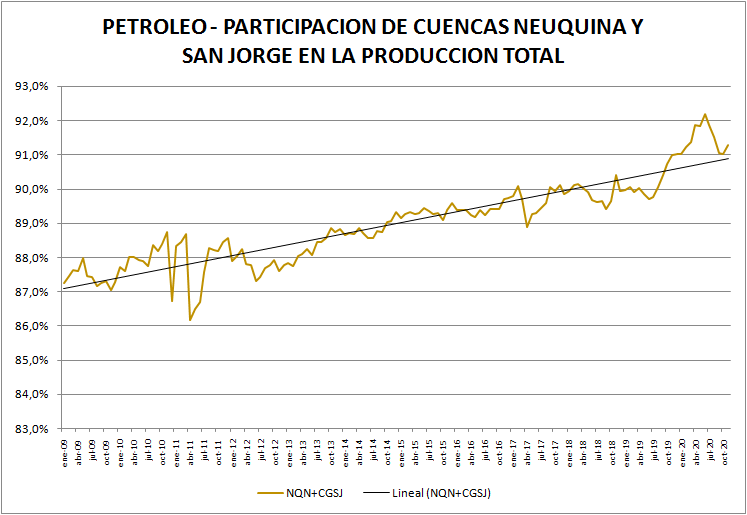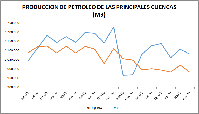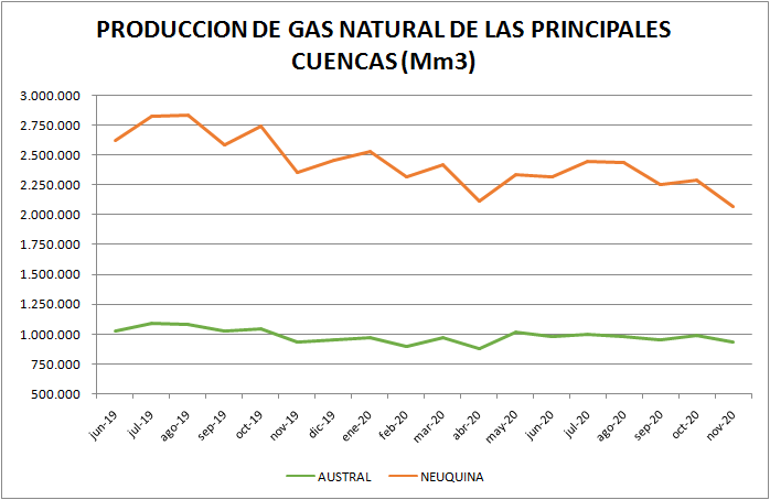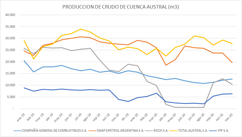 La particular situación de Cuenca Austral, con un caída del 27,9% se debe, en gran parte, a la situación de la empresa ROCH, que había entrado en default en julio del año anterior al no pagar un vencimiento de Obligaciones Negociables. Esta empresa bajó su producción un 69,11% en los once meses de 2020 respecto al 2019.