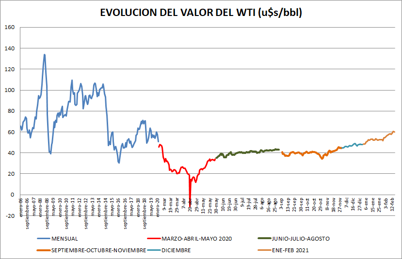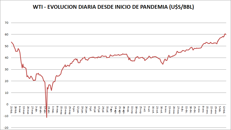 El petróleo crudo West Texas Intermediate cotizó ayer en los mercados de futuros (marzo 2021) en 60,00 dólares por barril, con un spread de 0.65 u$s/bbl.