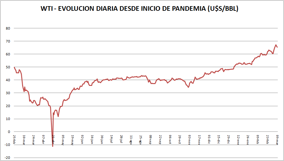 En el gráfico vemos que el WTI cotizaba a 50 dólares por barril el 25 de febrero de 2020 y cotizó a 65,30 u$s/bbl el día de ayer (un poco antes del cierre).