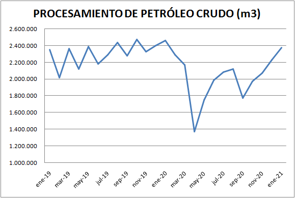 A continuación incluimos a los biocombustibles, no por su importancia volumétrica sino por la incidencia que tienen en la formación de precios en naftas y gasoils. Volumétricamente representan el 3,0% de las cargas procesadas en enero de 2021. Recordemos que, a pesar de haberse llegado a un acuerdo, recién en junio de 2021 se recuperará totalmente la utilización de biocombustibles. Sobre todo el biodiesel.