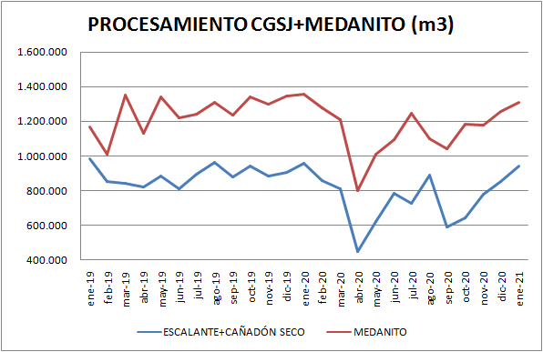 Teniendo en cuenta que el 94% del crudo procesado resulta de la suma de Escalante y Medanito, mostramos su evolución: