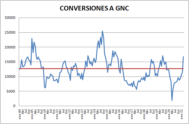 El promedio que se observa en el gráfico es el del total de la serie, que va desde enero de 2000 hasta marzo de 2021, y es de 12.660 conversiones por mes. De los últimos meses, el único que supera ese promedio es el de marzo de 2021.