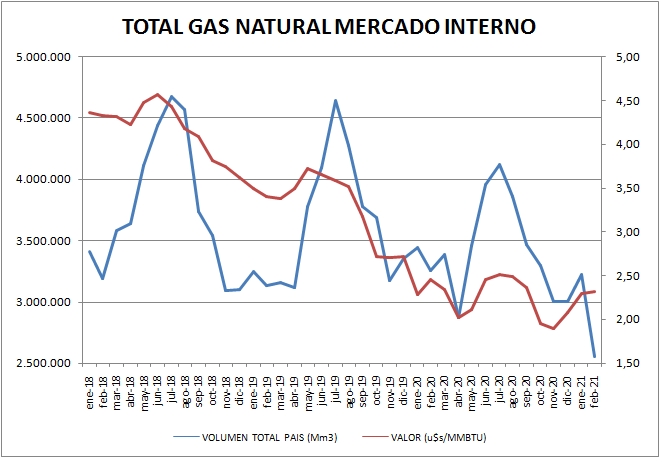 Los precios has descendido desde valores cercanos a 4,50 u$s/MMBTU, casi coincidiendo con el pico de consumo, hasta los actuales, de algo menos de 2,50 u$s/MMBTU. En febrero de 2021 se detiene la caída constante. El valor es apenas un 1,74% inferior al de enero de 2021.