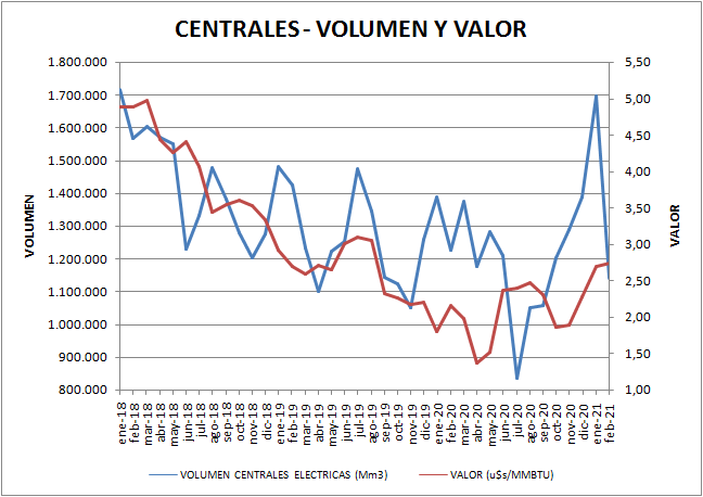 Importante descenso de la utilización de gas natural para generación eléctrica. El volumen consumido bajó de 54,7 MMm3/día en enero de 2021 a 40,7 en febrero. Una caída del 25,6%.