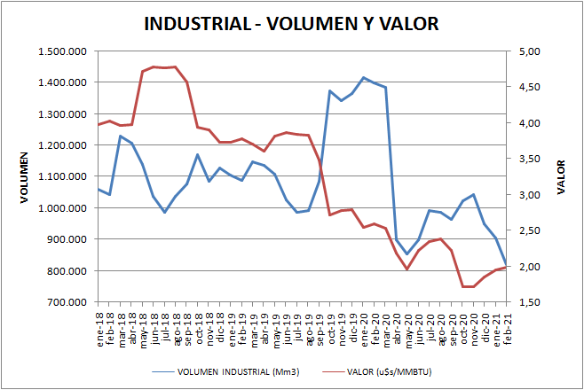 Sigue cayendo el volumen consumido por el sector industrial. El valor de febrero de 2021 es un 9,3% menor que el de enero y un 41,3% inferior al de febrero de 2020.