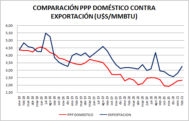 De todas formas, el gráfico nos muestra, claramente, el deterioro que han tenido los valores desde enero de 2018 (primer valor publicado) con cerca de 4,50 dólares por millón de BTU, hasta febrero de 2021 con 2,32 u$s/MMBTU.