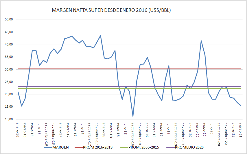 El margen bruto de nafta super sigue su caída desde diciembre de 2020.
