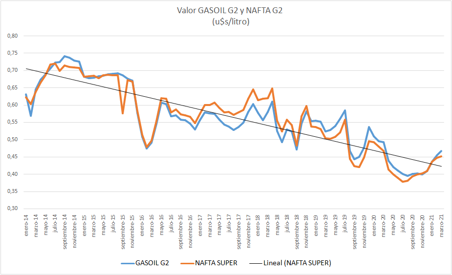 Lo que no remonta es el valor en planta de despacho sin impuestos, que solamente ha subido en el último año, desde marzo de 2020 a marzo de 2021 un 39,50% (en pesos) en la nafta super y un 36,69% en el gasoil. Estos valores sufren un atraso respecto a la evolución de los precios generales de la economía.